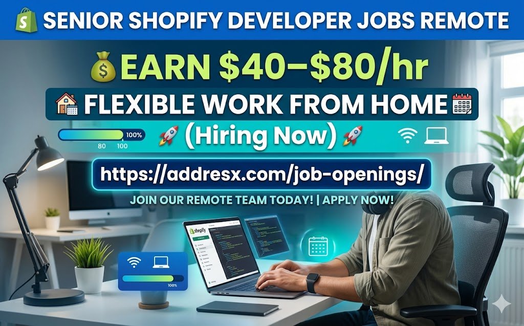 Job Title: Senior Shopify Developer (Remote – Worldwide Hiring) Company: ProWriterSites (Posted via AddresX Job Openings) Job Type: Full-Time / Part-Time / Contract Location: Remote (USA, UK, Canada, Kuwait, UAE & Global) Salary: $40–$80 per hour Work Model: Work From Home